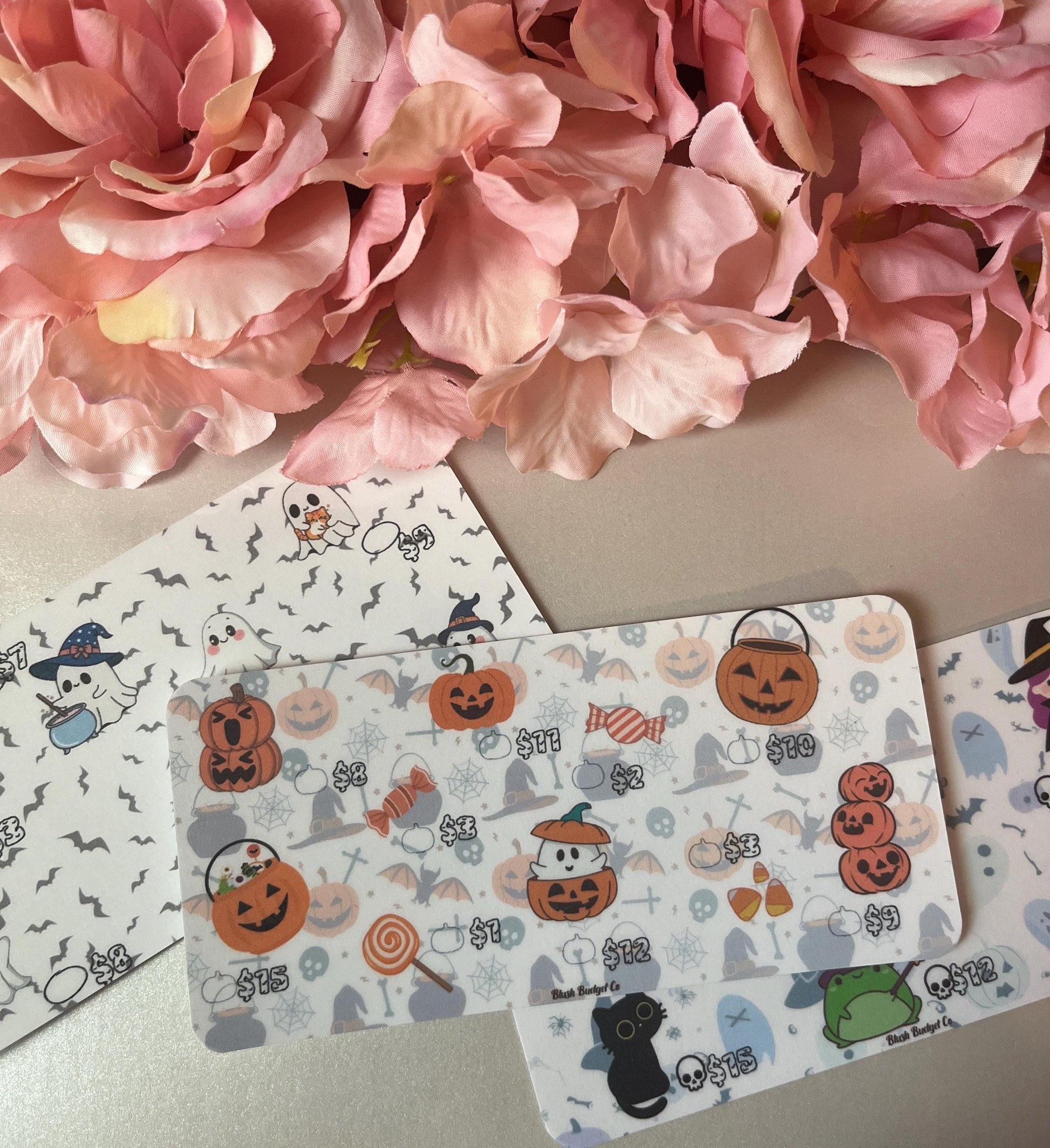 Cute simple Trick or treat themed savings challenge. Small circles to check mar and keep your progress! Each card has its own theme! This listing has three savings cards! Glossy laminated cardstock with rounded corners and approximately 6 x 3. This item is handmade!